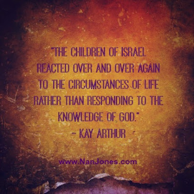 In Lord, I Want to Know You, Kay Arthur wrote, "The children of Israel reacted over and over again to the circumstances of life rather than responding to the knowledge of God." All of us are guilty of that sometimes. Perhaps it's human nature. Perhaps it boils down to the requisite of walking by faith and not by sight - to being in this world, but not of this world.